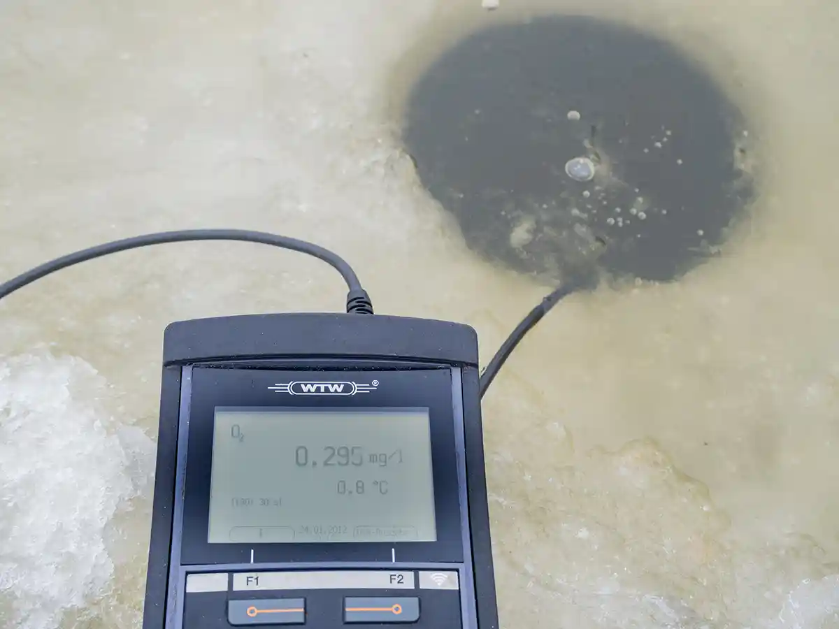 Tödliche Werte: In vielen zugefrorenen Gewässern liegt der Sauerstoffgehalt derzeit unter einem Milligramm pro Liter. © Matthias Emmrich (AVN)